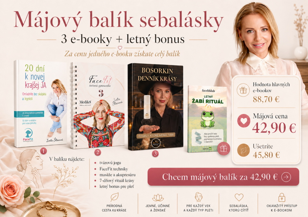 Májový balík sebalásky obsahuje 3 hlavné e-booky tvárovej jogy, FaceFit techník, masáží, akupresúry a 7-dňových rituálov. Navyše získate Letný žabí rituál ako bonus. Hodnota hlavných e-bookov je 88,70 €, májová cena je 42,90 €. Zaplatíte cenu jedného e-booku a získate celý balík.